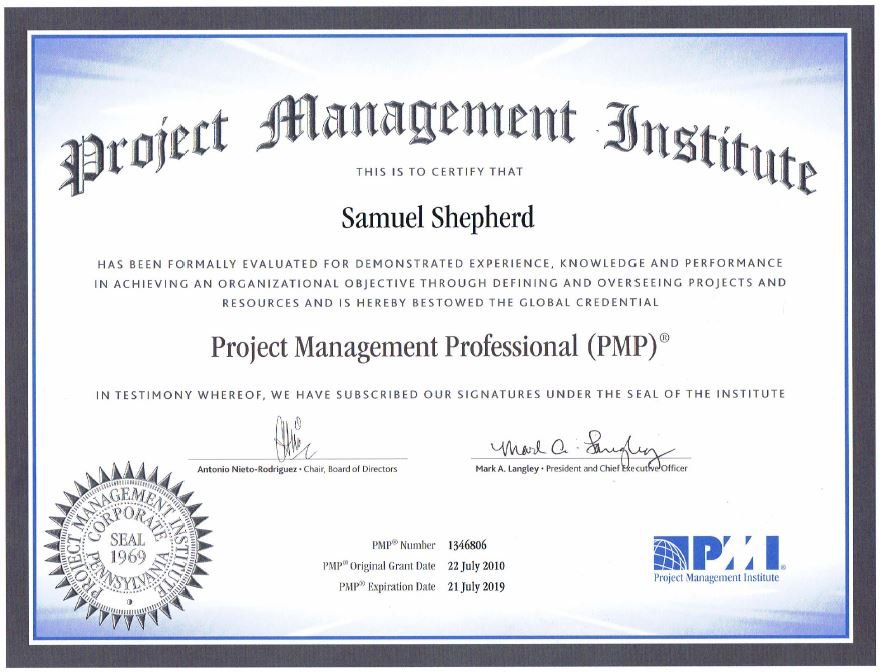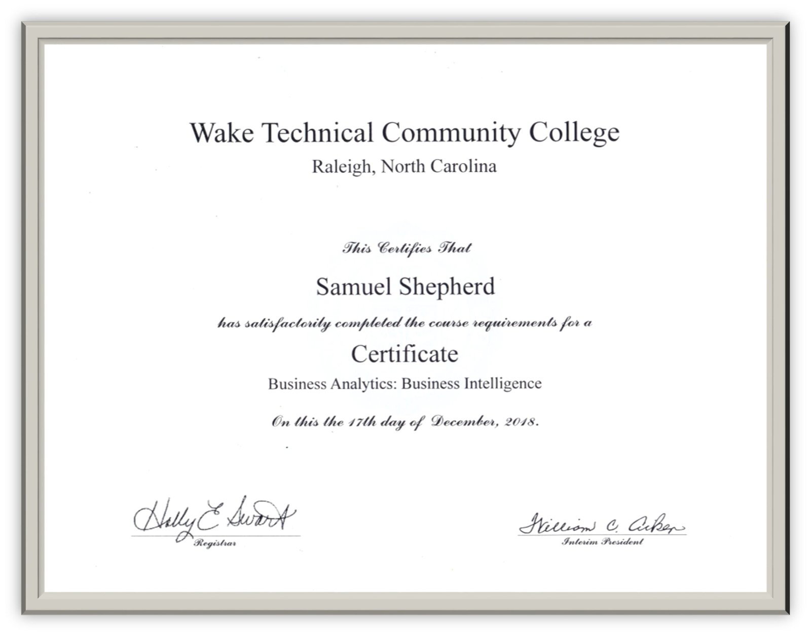 After military service, Mr. Shepherd earned a Technical degree and a Business Intelligence certificate from N.C. Community Colleges, Marketing and Management Bachelors’ degree from a major University, a Master’s in Project Management from a state university, and certifications in Microsoft’s Excel 2010 and Microsoft’s Access 2013, Six Sigma greenbelt (2010), and the Project Management Professional (2011) (PMP) certification.